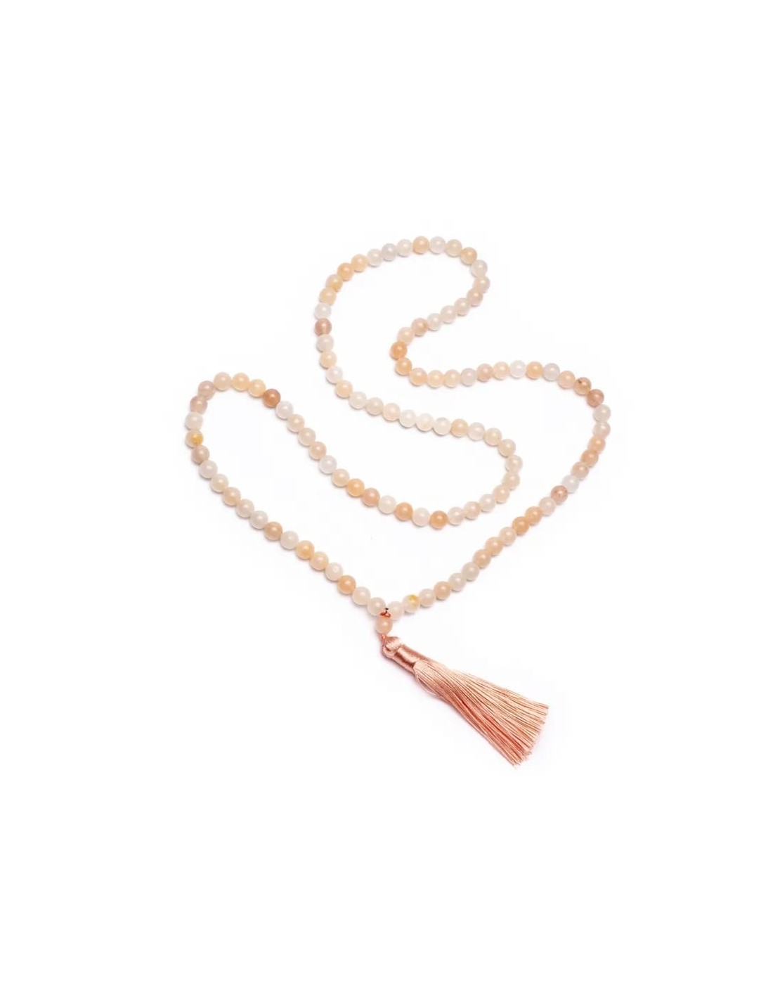 Mala o Terço budista com 108 contas de aventurina pêssego (tons de rosa pálido) e uma borla cor de salmão.